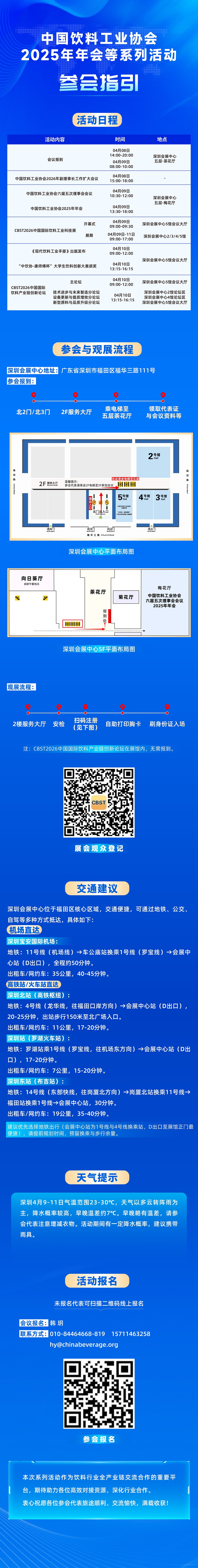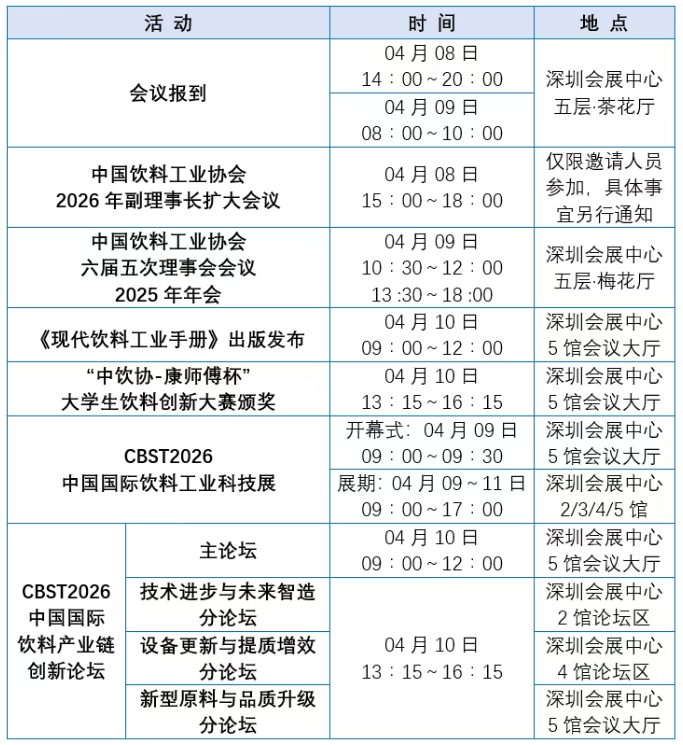 中国饮料工业协会2025年年会等系列活动,计划于2026年04月08日至11日在深圳举办。时值“十四五”规划收官、“十五五”规划谋篇布局的关键阶段,本次年会将系统总结“十四五”期间行业发展的成果与经验,深入剖析当前行业所面临的新形势、新机遇与新挑战,凝聚共识,共同探讨“十五五”期间饮料行业实现高质量发展的路径与举措。