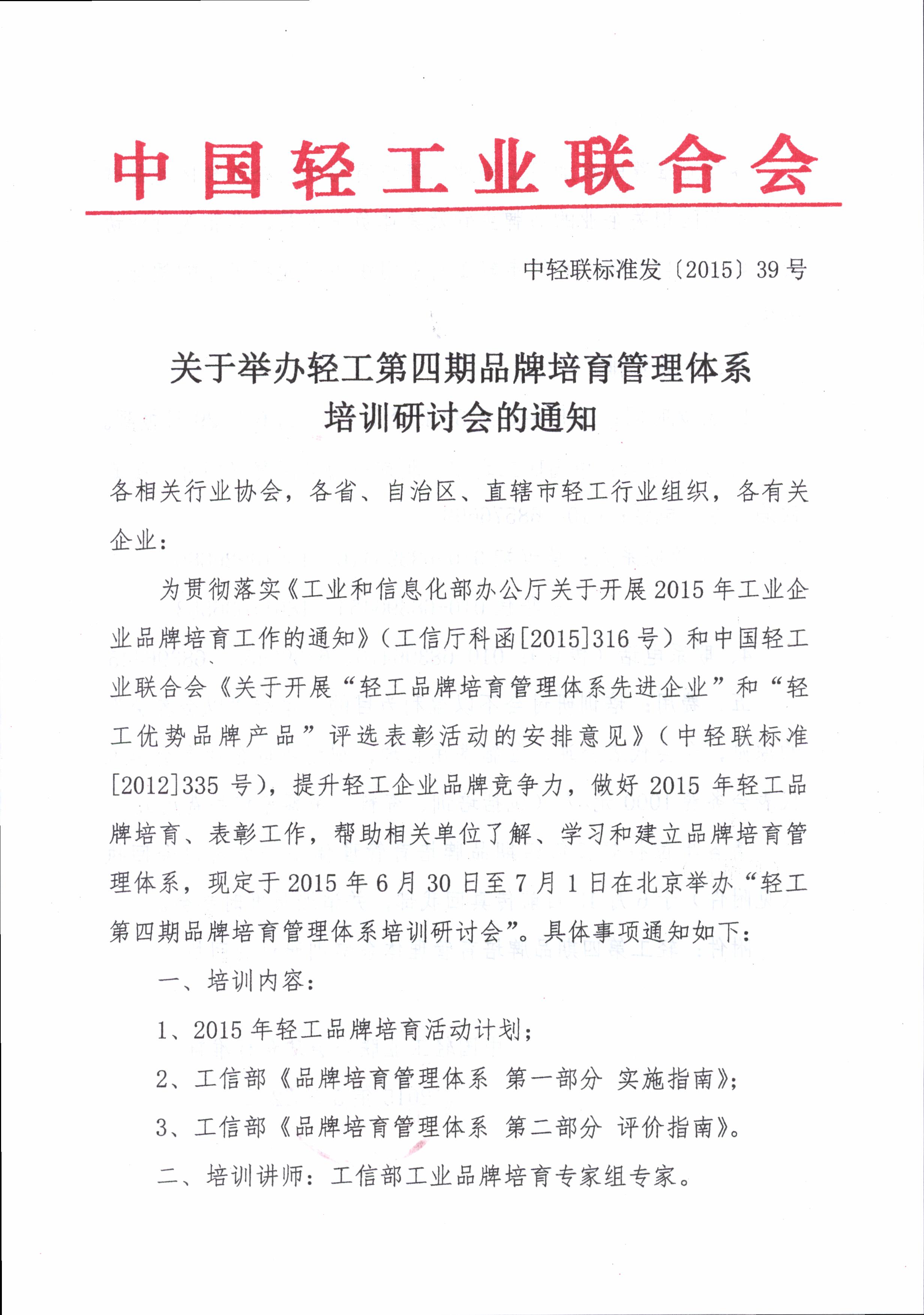 中国轻工业联合会于2015年6月30日-7月1日举办轻工第四期品牌培育管理体系培训研讨会,通知如下:
